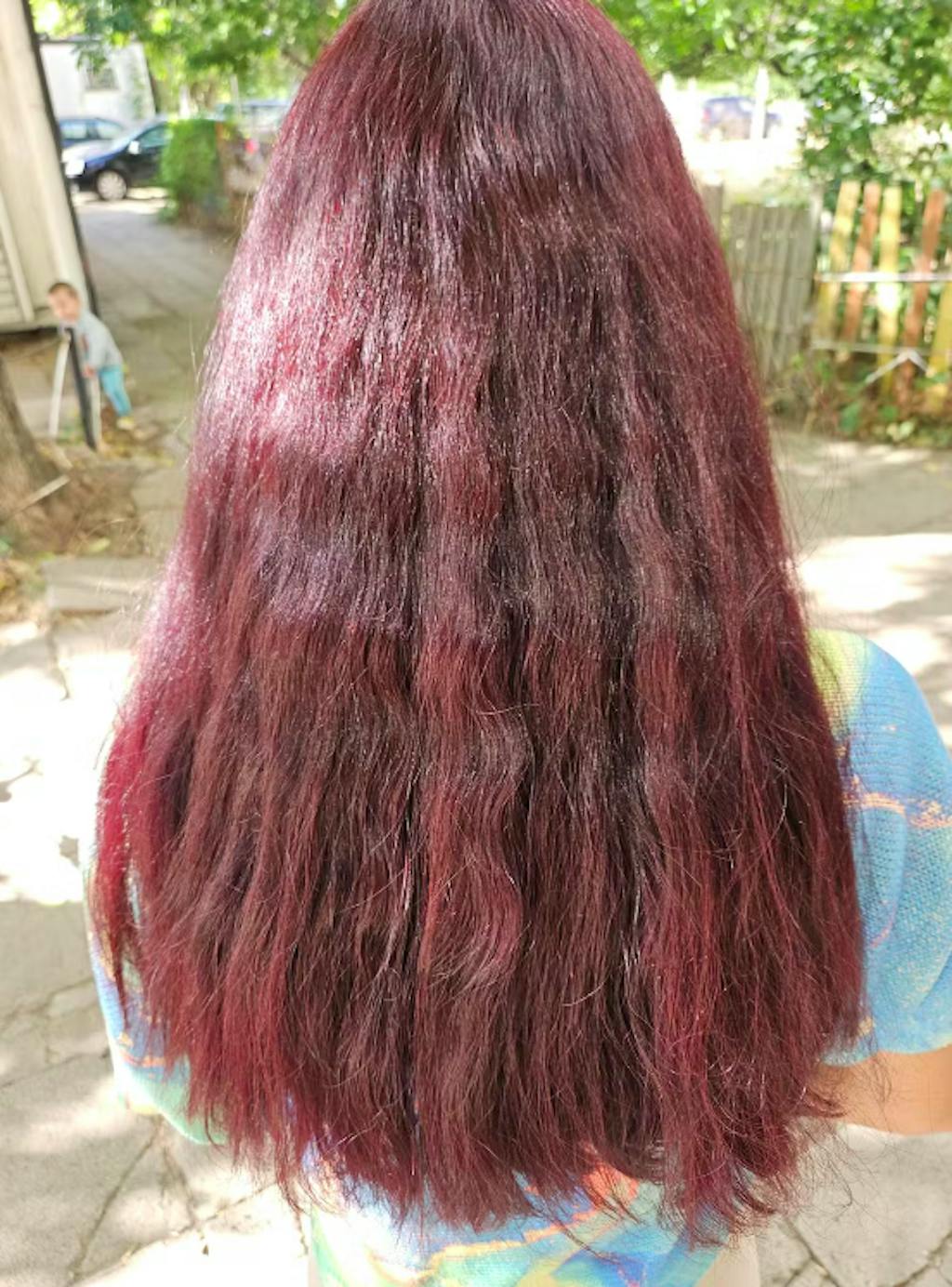 Estou muito satisfeita com os produtos escolhidos. Apesar de os utilizar uma ou duas vezes por semana, vi resultados. O meu cabelo era bastante seco, emaranhava-se e caiu muito após o parto. A queda de cabelo diminuiu de facto e pentear é muito mais fácil. O cabelo está bastante revigorado. Curiosamente, quando pintava o meu cabelo antes, a tinta saía quase imediatamente - após 1-2 banhos e a toalha ficava manchada. Desde que comecei a utilizar estes produtos, a mancha da toalha ainda existe (após um mês), mas é menor durante todo o tempo, o que me leva a crer que a minha cor permanece mais tempo e, como pode ver nas fotografias, é mais intensa em todo o comprimento. Os cabelos brancos aparecem nas raízes, onde o meu cabelo cresce, mas isso é normal. O meu cabelo está com melhor aspeto, mesmo passado um mês, depois de o ter pintado. Estes produtos são óptimos, vou mesmo continuar a usá-los!