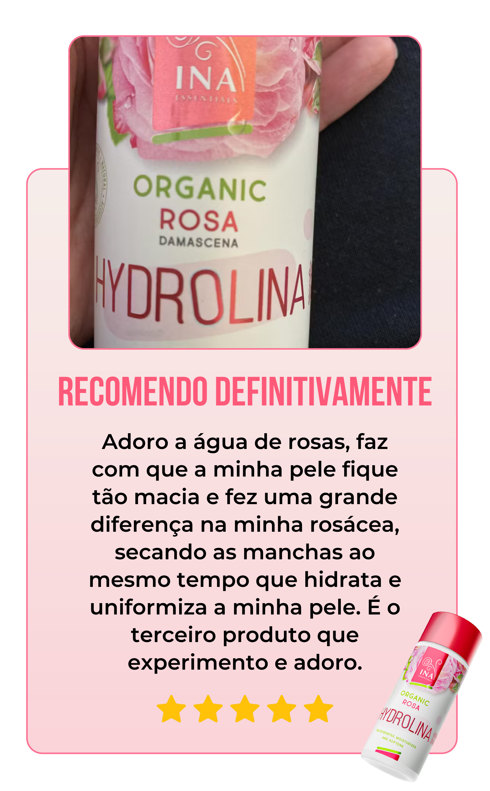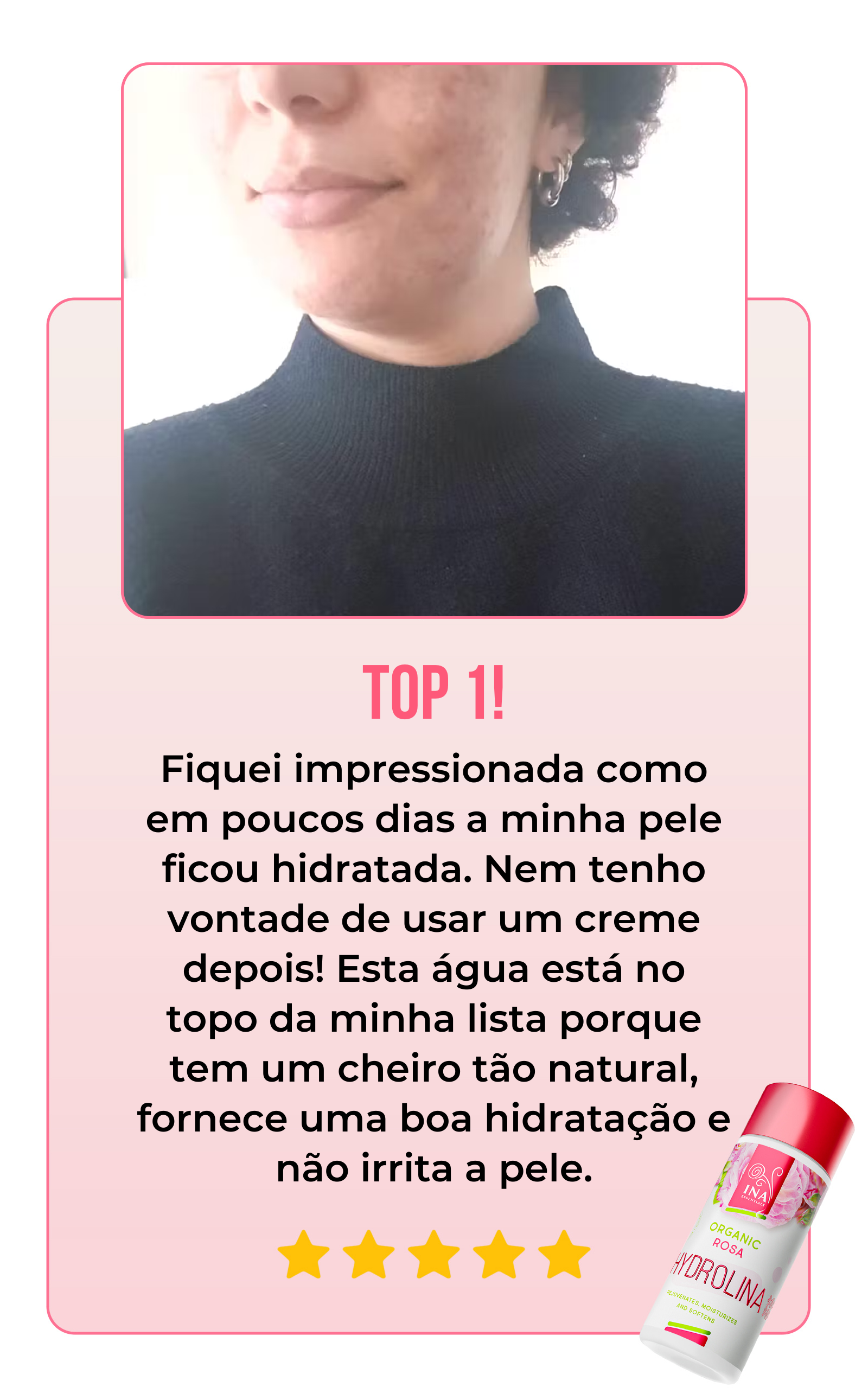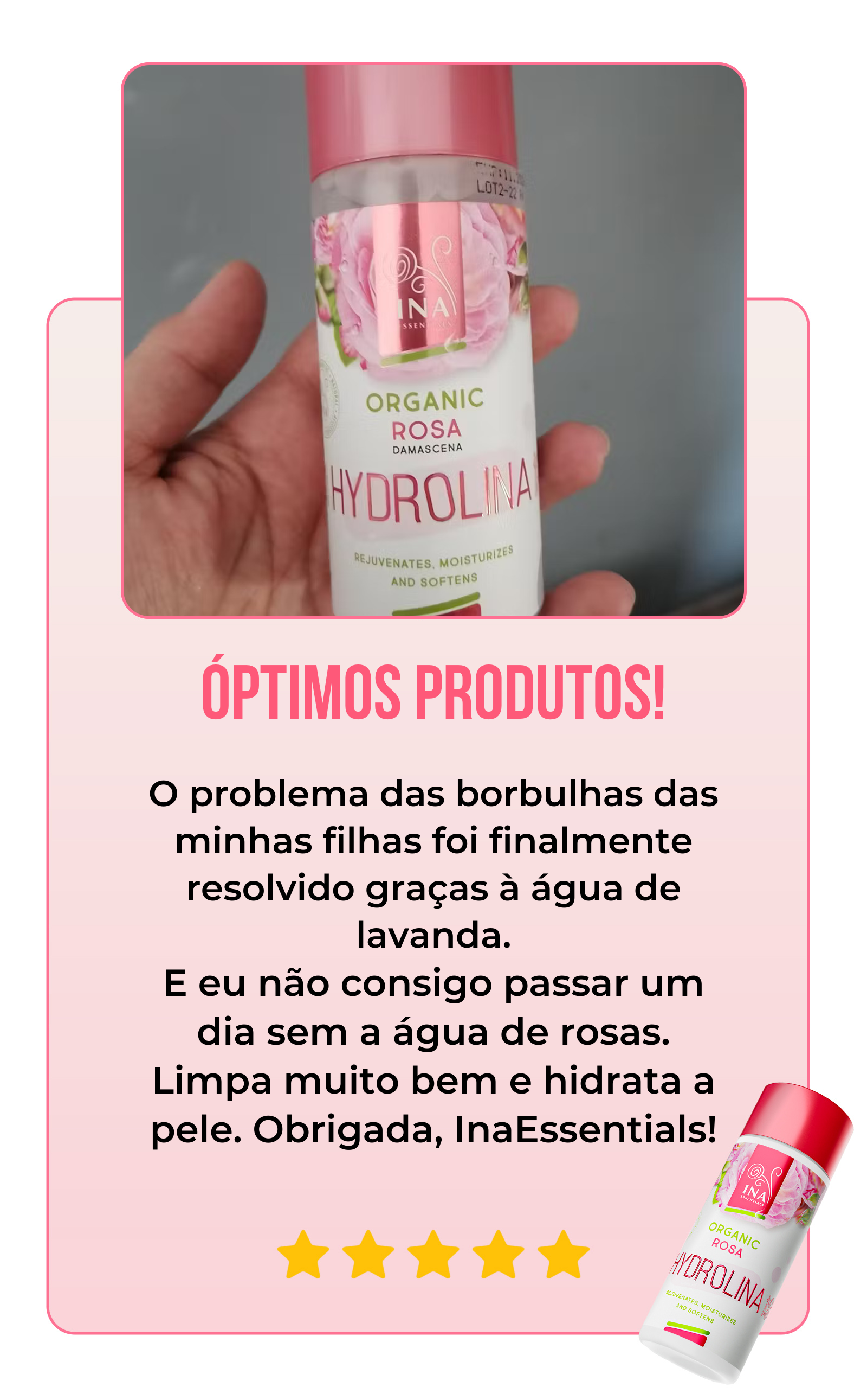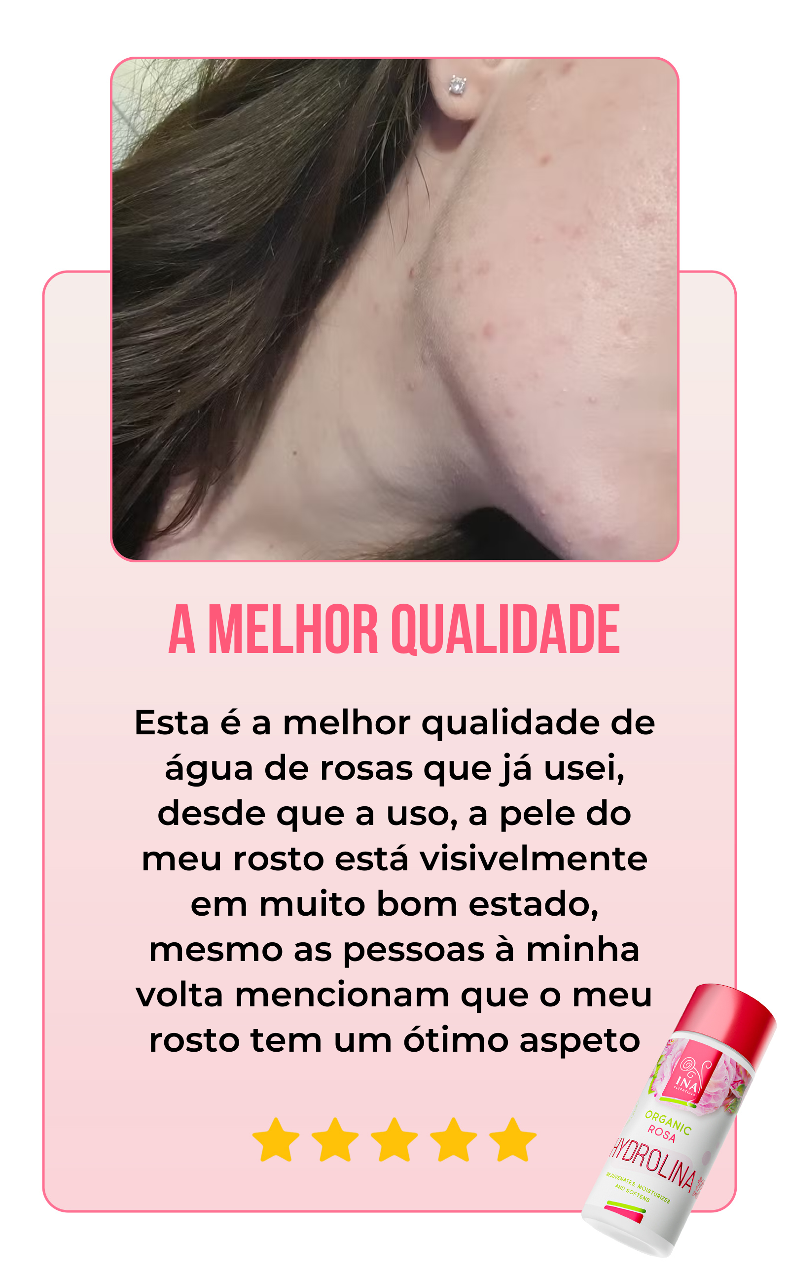 A Hydrolina de Rosas (150ml) é mais do que apenas um frasco bonito, é apoiada em testemunhos autênticos de clientes. Com um impressionante índice de satisfação dos clientes superior a 90%, o nosso produto demonstra a sua eficácia no combate à pele seca e às linhas finas, ao mesmo tempo que melhora a saúde cutânea. Para além da nossa palavra, leia as histórias dos nossos clientes.