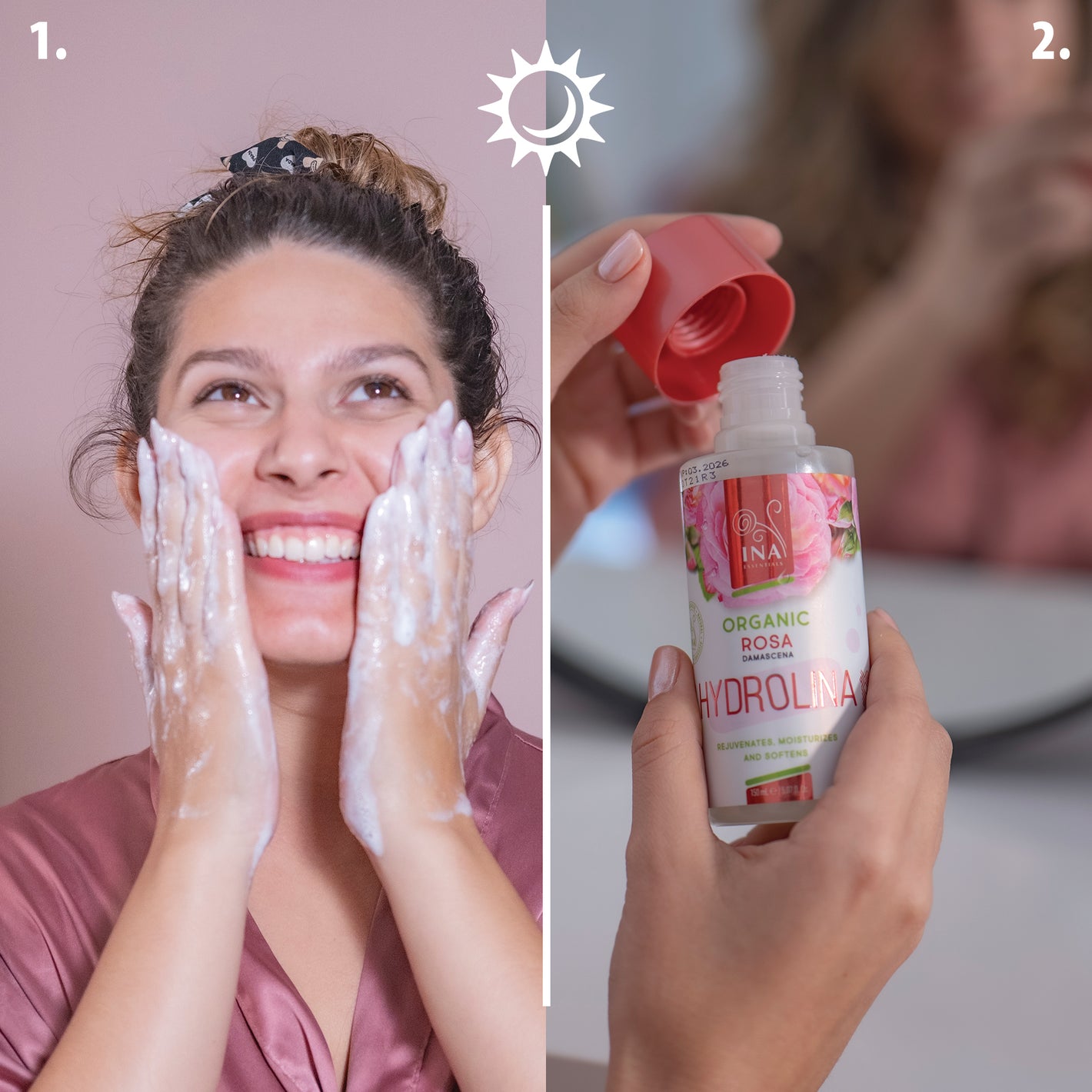 - Passo 1: De manhã, comece por lavar o seu rosto com o nosso Sabonete Orgânico de Ervas com Óleo de Rosa Damascena e Gerânio para remover as impurezas que a pele libertou durante a noite e para hidratar a pele.