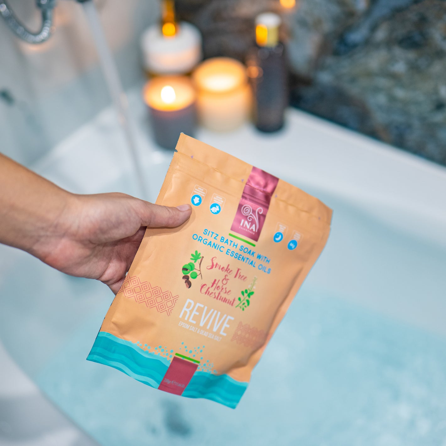 • O Óleo de Árvore de fumo tem um efeito antioxidante e estimula a regeneração da pele dos pés. Os sais de banho Revive podem ser combinados com o creme Remorrhoids InaEssentials com a castanha da Índia e a Árvore de fumo para uma ação sinérgica.