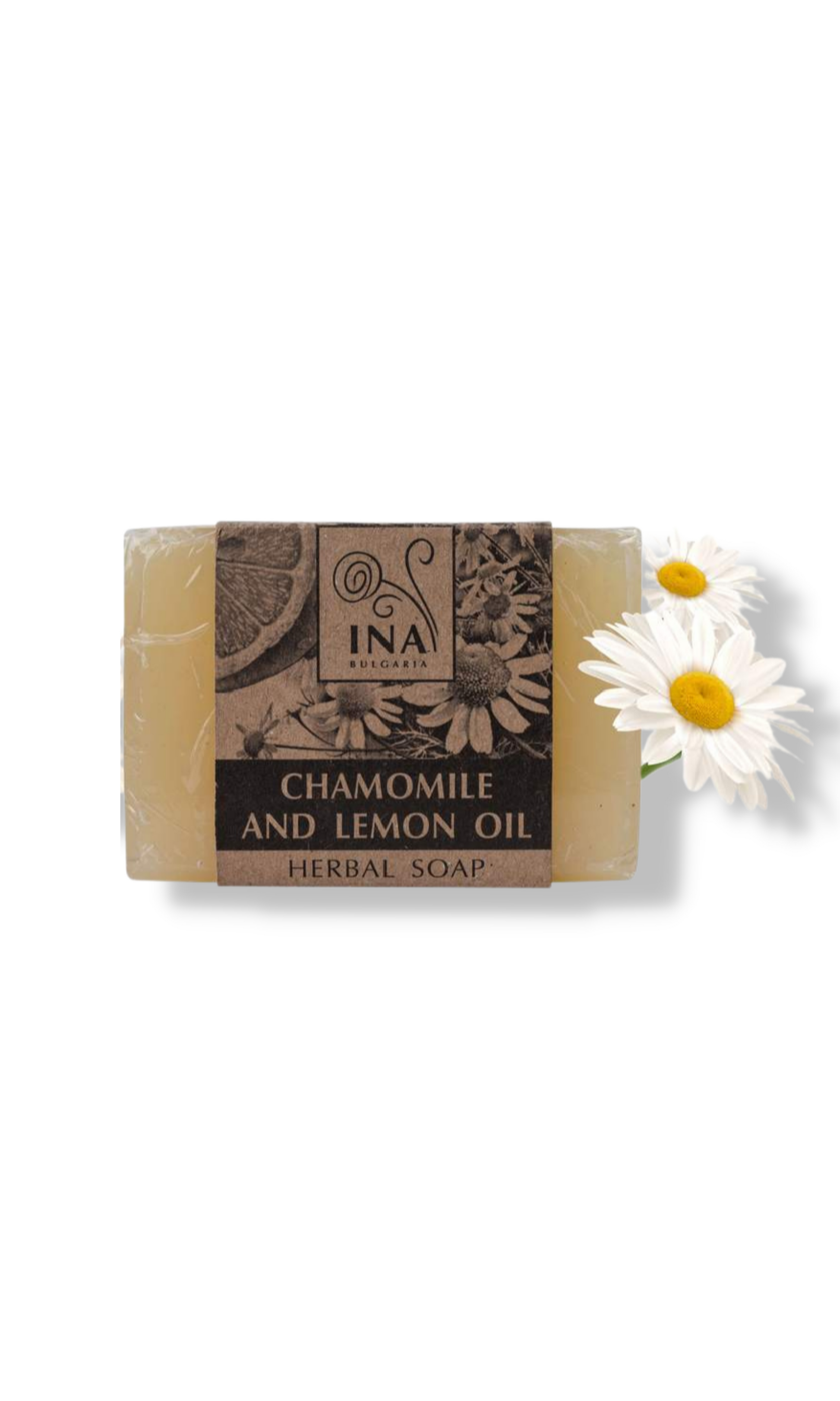 Sabonete artesanal, natural, enriquecido com óleo essencial de camomila 100% puro de alta qualidade e com um toque de limão.